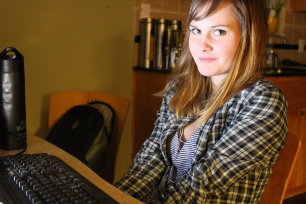 A pretty girls wearing a plaid shirt over a striped t-shirt is sitting at a computer.