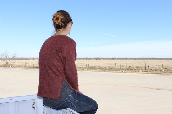 Here sits a skinny caucasian woman in denim jeans on the back edge of a pickup truck watching the cows graze the ranchland off in the distance.
