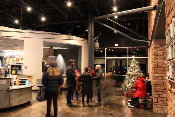 Three groups of people stand in the lobby on a concrete floor, in the corner is a lite Christmas tree next to a window.