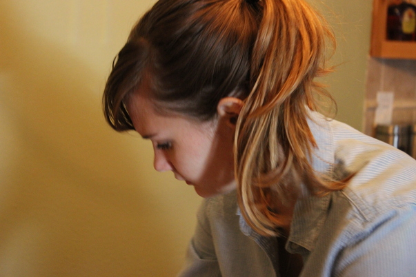 The girl with her brown hair in a ponytail leans forward to look at something that she is doing.