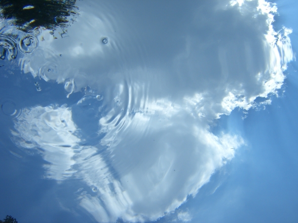 A unique photo of a white cloud in a beautiful blue sky reflected in water as it begins to rain.