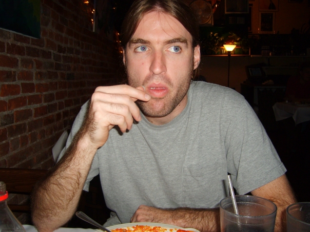 A good looking guy with long straight brown hair and nice big blue eyes sitting in front of his meal in a restaurant, while in deep concentration or conversation.