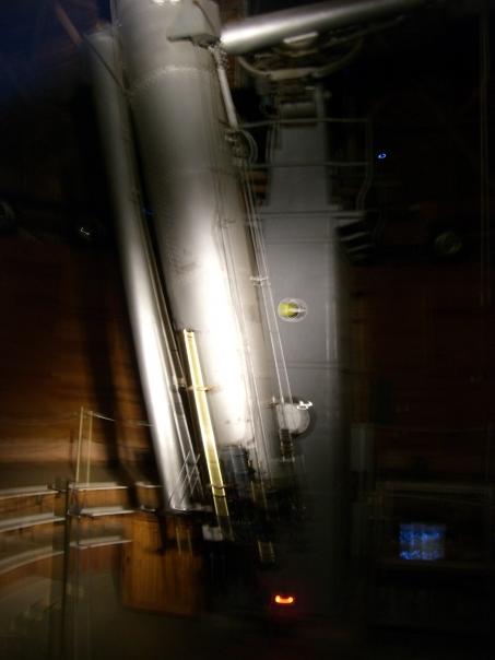 A blurry photo of a dark room with wooden walls in which the subject is something made of metal.