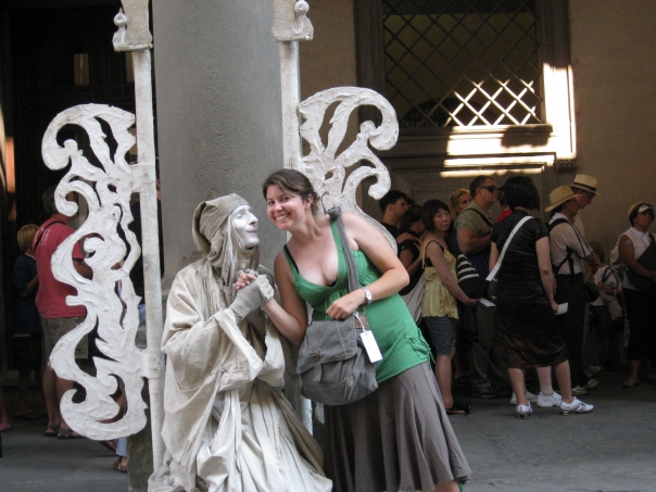 Girl in green too small top mugging for camera with old lady in 12th century dress or dressed statue. Line of tourists in background.