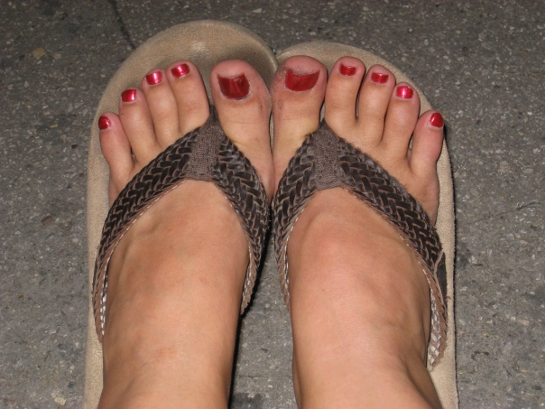 Closeup photo of a woman's feet which are resting in tan and brown sandals, and the toenails are painted very bright red
