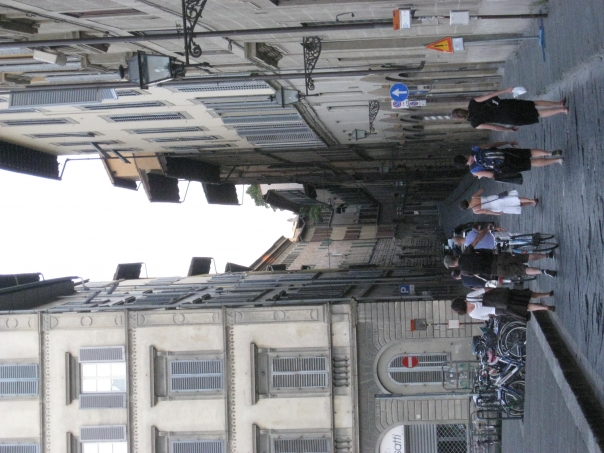 People and bicyclists walking down an alley of a European style city