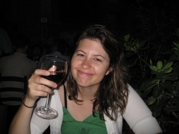 A young girl wearing a green top an white sweater appearing tbe enjoying a glass of red wine in an outdoor settting.