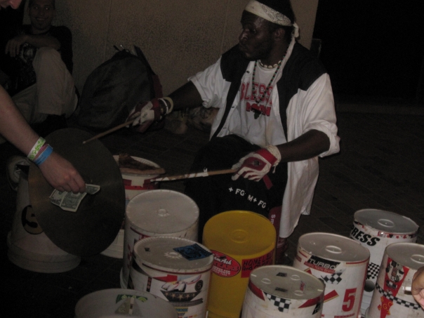 A person gives a few dollars to a man in a black and white outfit and white bandanna who is using buckets as makeshift drums to make some music.