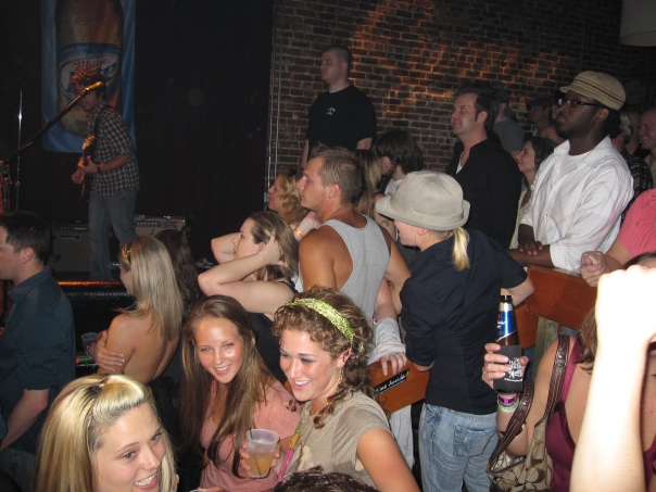 A crowd of young men and women visit while watching a band play.