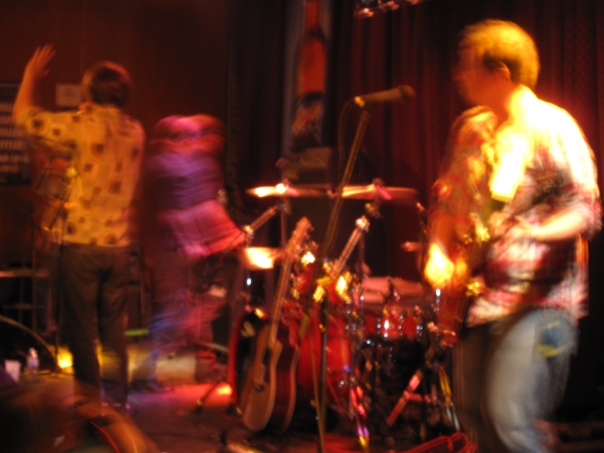 In this blurry scene, guitarists play their instruments while the singer performs.