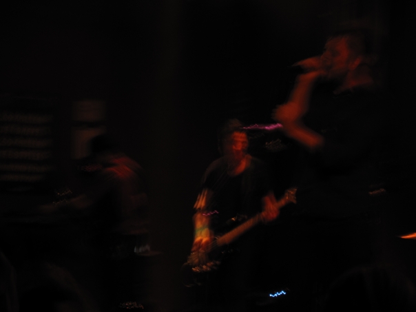 A dark and blurry picture of a band onstage with three members visible.