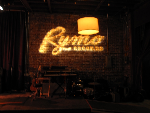 A lighted sign "Rymo" is projected onto a brick wall behind an empty stage in a restaurant.