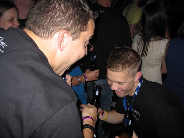 Two young males smile at each other, apparently happy to be imbibing at this party.
