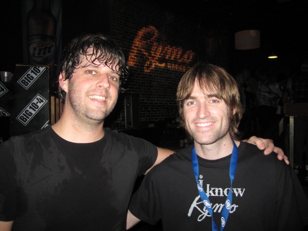 Two mean in black shirts posing for a picture, one of them appears very sweaty.