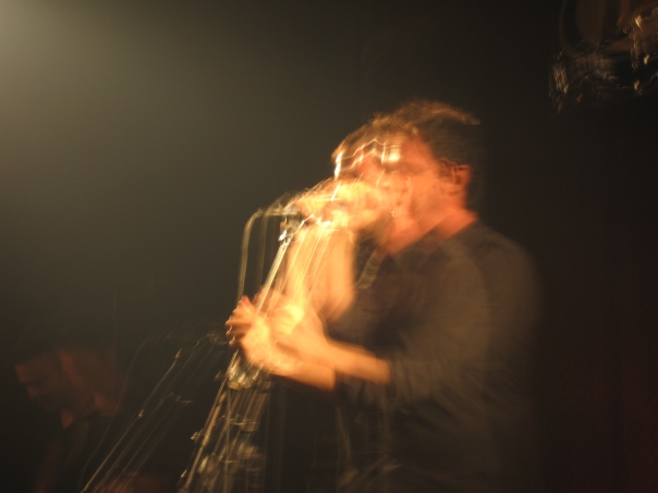 This is a blurry picture of a man in a black shirt with a microphone.