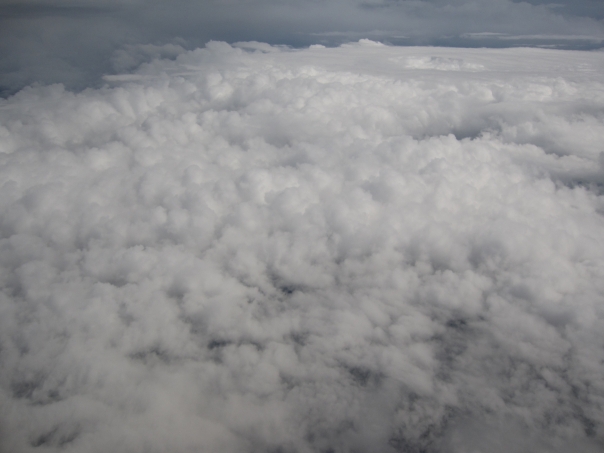 A dramatic overhead view of some thick cumulous clouds seen from an airplane.