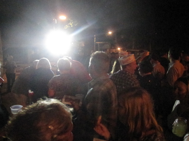 A very large group of people having fun outside, drinking, and laughing during the night.