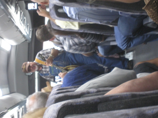 A man in a flannel shirt and cap playing a banjo on a crowded airplane.
