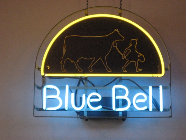 A blue and yellow neon Blue Bell ice cream sign is hanging on the wall.