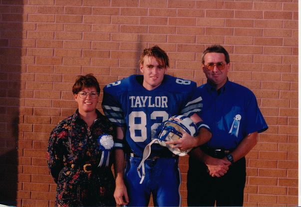 A football player in a blue and white uniform holding his helmet and standing in between a man and woman. |