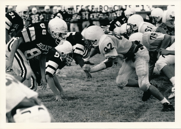 Two opposing football teams, one with dark shirts and the other with light, start to play against each other. |