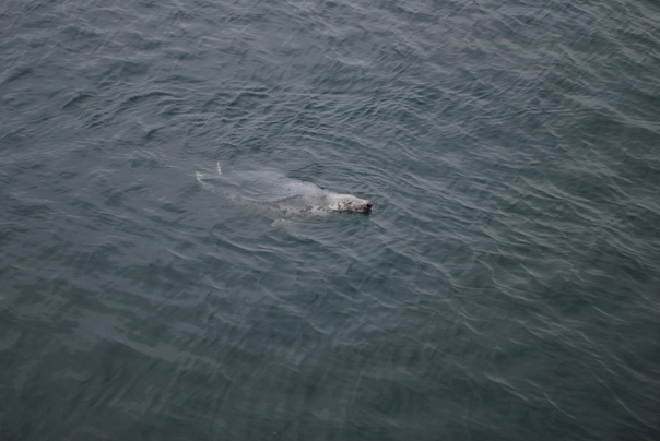 This picture shows the ocean with what I believe is a grey sea lion swimming.