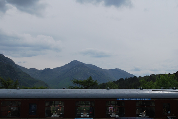 The Glenfinnan Dining Car passing by mountains on a cloudy day.