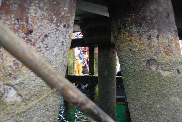 Tug boat worker in yellow overalls as viewed thru moldy dock pylons.