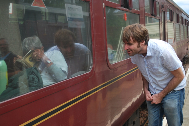 A MAN IS SEEN PEERING INTO THE WINDOW OF A RED TRAIN CAR, WHILE INSIDE, AN OLDER WOMAN HIDES HER FACE IN A BOOK.