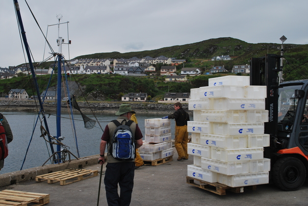 Men are working on a loading dock at a harbor, and there are many houses on the green hillside beyond the water.