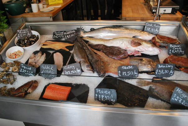 There is fresh fish and seafood on ice in the market for sale.