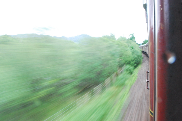 Lush green landscape flying by as a red train quickly passes by.