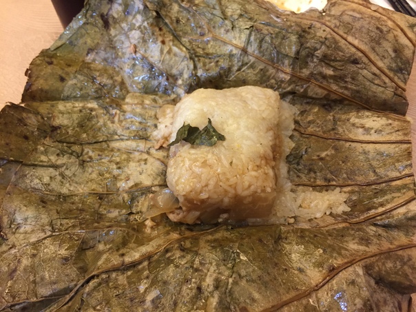 A square of rice and onions sits upon a leaf arranged like expensive food.