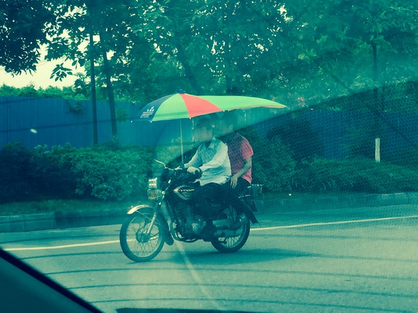 A couple of male lovers riding a motorcycle while clutching an umbrella.