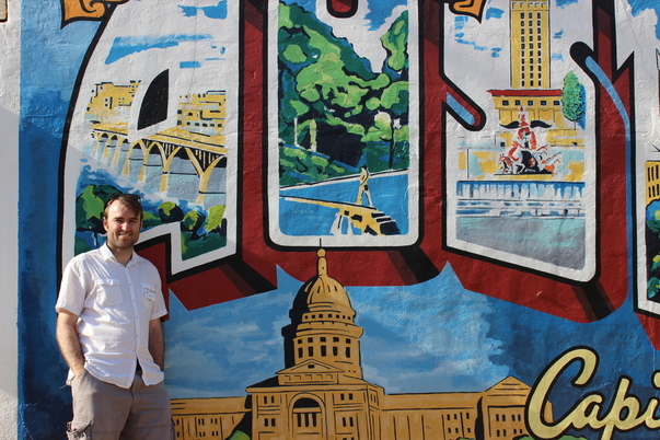 A man smiling next to an intricate mural in a foreign country.