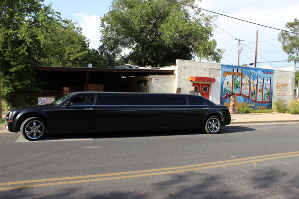 A black super-stretch limo waits in front of a building with orange doors and a brightly colored mural.