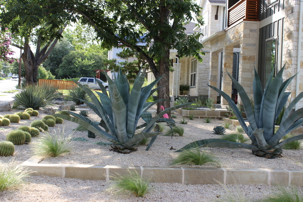 These Blue Agave plants grow in a desert style landscaped front yard.