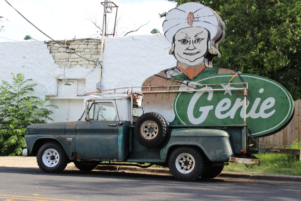A giant Genie advertisement sign sits in the bed of an old, rusted truck.