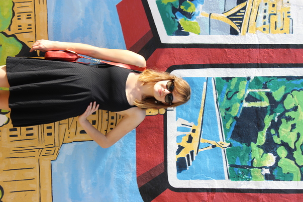 The woman is posed for the cameraman in front of the artwork and is wearing a breezy dress and sunglasses.