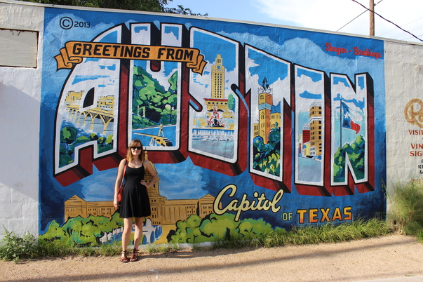 A girl poses for a picture in front of a greetings from Austin, capital of Texas mural.
