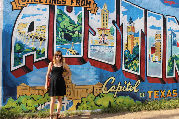 Woman wearing a black tank dress and sunglasses stands in front of a mural for Austin - Capitol of Texas.