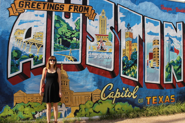 This woman stands in front of a brightly colored mural of Austin, Texas.
