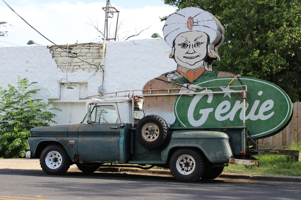 An old rusty pickup truck hauling an old Genie hanging sign.