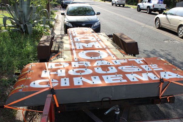 LAST NIGHT'S STORM BLEW DOWN THE HUGE RED AND WHITE SIGN OF THE CINEMA JUST BUILT.