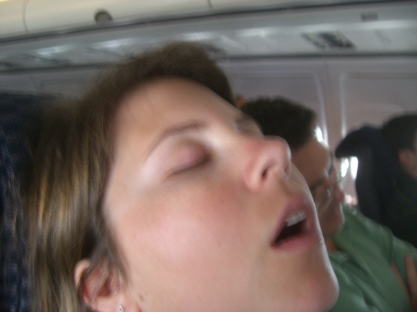 A young girl that is sleeping on an airplane, her eyes are closed, her mouth wide open and her hair is tucked behind her ears.