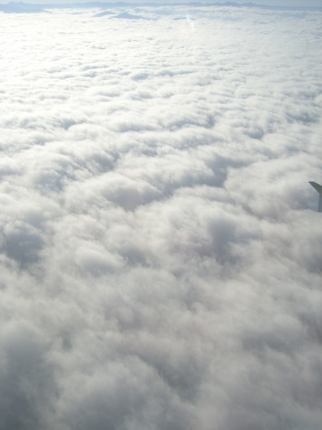 Photo of white clouds from above on a sunny day.Most likely taken from within an airplane.