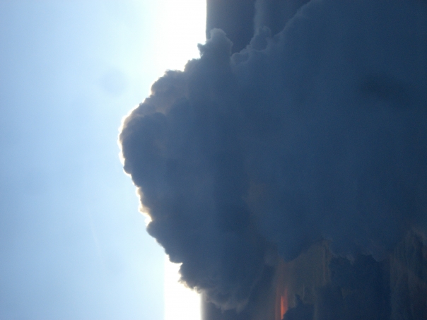 The billowing steel blue cloud grows in the pale blue sky above the earth.