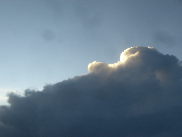Photo of the sky with a large cloud in it.The cloud is mostly dark with light coming through the tip of the left half.