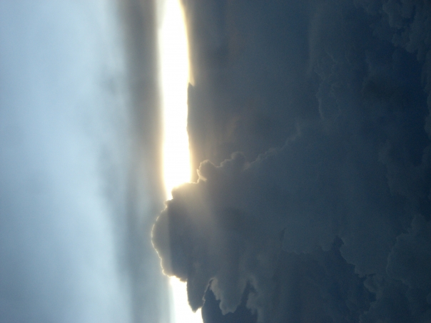 sunlight breaking over rolling thunderhead clouds under a blue toned sky