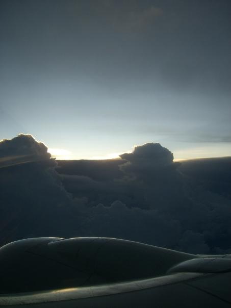 A view from the window of a plane on the sky, the sun shine throug the clouds